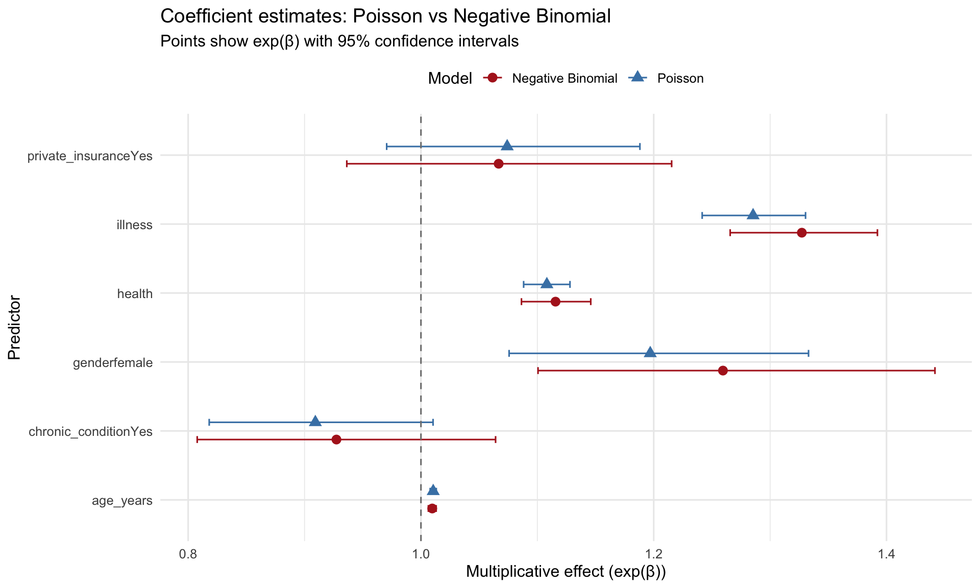 NB standard errors are **larger** than Poisson (ratio > 1) --> reflecting the true uncertainty when accounting for overdispersion.
