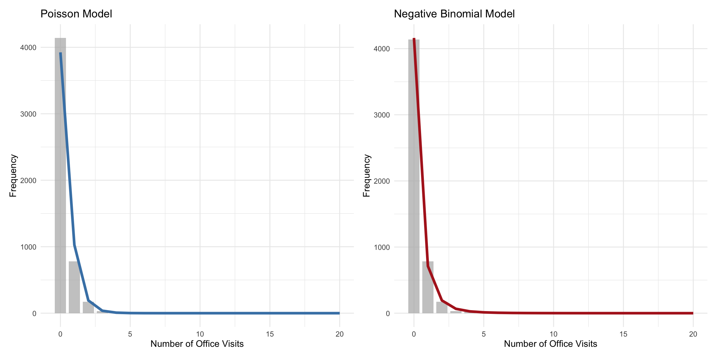 We'll use the `DoctorVisits` dataset from the AER package, based on the Australian Health Survey. This dataset includes: