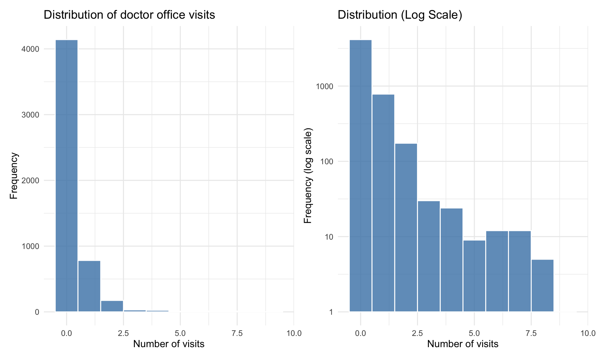 #| fig-cap: "Distribution of doctor visits is highly right-skewed"