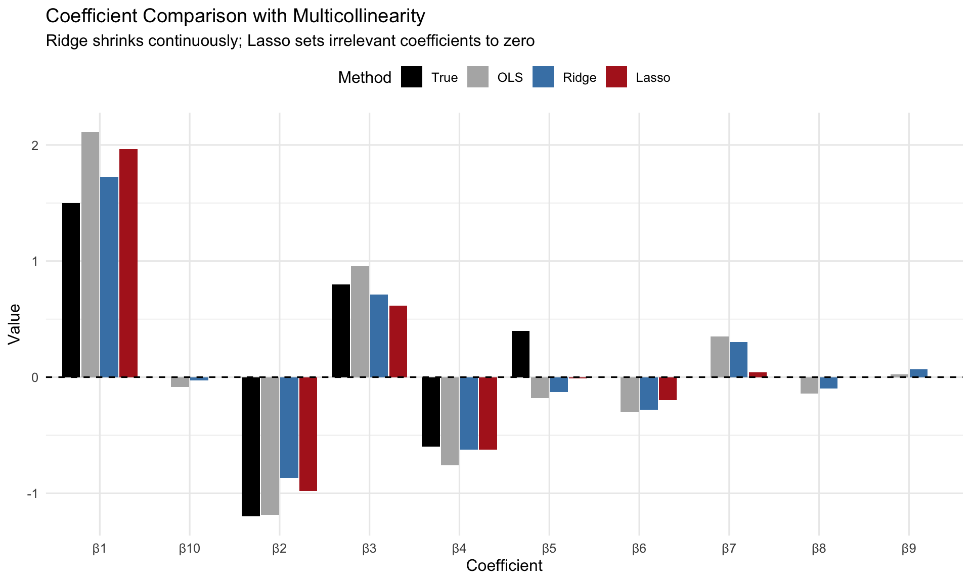 Value = c(true_beta, ols_coef, ridge_coef, lasso_coef),