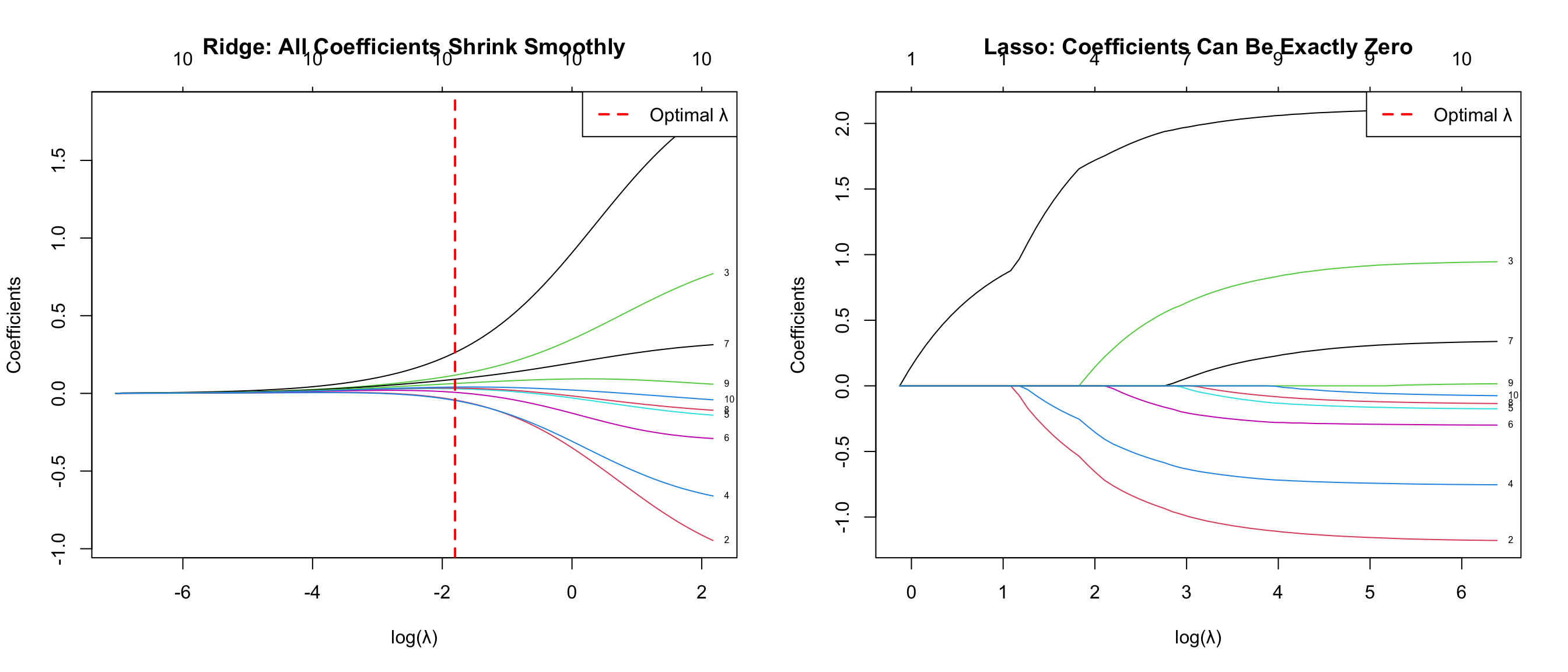 subtitle = "Ridge shrinks continuously; Lasso sets irrelevant coefficients to zero",