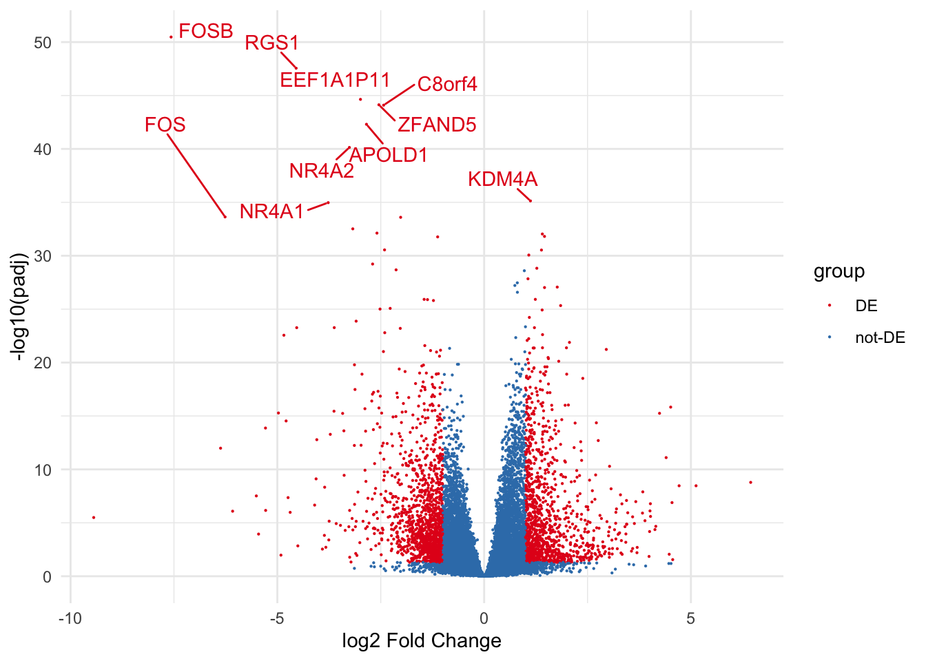 de_results$group <- ifelse(de_results$padj < 0.05 & abs(de_results$log2FoldChange) > 1, "DE", "not-DE")