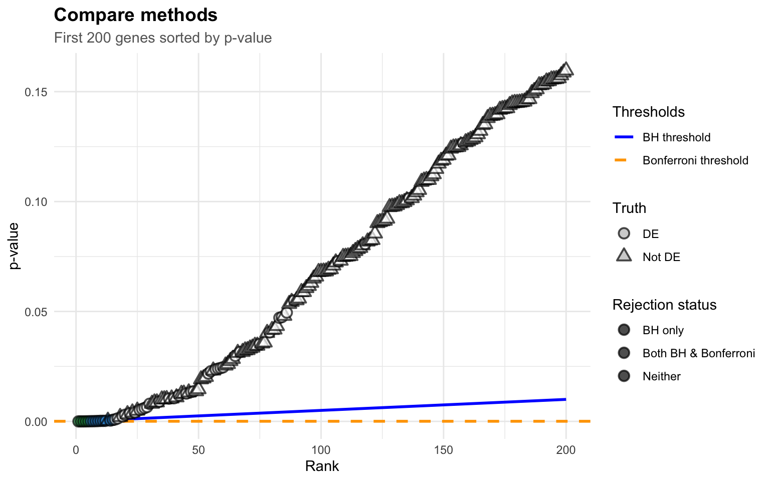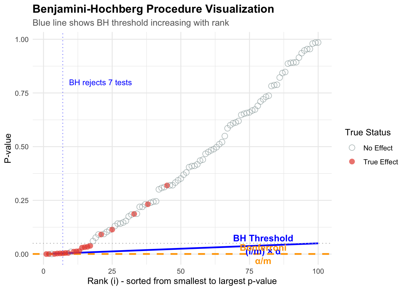 # Simulate a more realistic scenario: 100 tests, 20 are truly significantset.seed(123)n_tests <-100n_true <-20n_null <- n_tests - n_true# Generate p-values# True alternatives: small p-values (from exponential distribution)p_true <-rbeta(n_true, 0.5, 10)# True nulls: uniform p-valuesp_null <-runif(n_null, 0, 1)# Combine and create datasetp_values <-c(p_true, p_null)true_status <-c(rep("True Effect", n_true), rep("No Effect", n_null))test_data <-data.frame(test_id =1:n_tests,p_value = p_values,truth = true_status) %>%arrange(p_value) %>%mutate(rank =row_number(),bh_threshold = (rank / n_tests) *0.05,bonf_threshold =0.05/ n_tests,significant_bh = p_value <= bh_threshold,significant_bonf = p_value <= bonf_threshold )# Find the BH cutoffbh_cutoff <-max(which(test_data$significant_bh))# Create the visualizationggplot(test_data, aes(x = rank, y = p_value)) +# BH threshold linegeom_line(aes(y = bh_threshold), color ="blue", linewidth =1, linetype ="solid") +# Bonferroni threshold linegeom_hline(yintercept =0.05/ n_tests, color ="orange", linewidth =1, linetype ="dashed") +# Alpha linegeom_hline(yintercept =0.05, color ="gray", linewidth =0.5, linetype ="dotted") +# Points colored by truthgeom_point(aes(color = truth, shape = truth), size =3, alpha =0.7) +# Highlight the BH cutoffgeom_vline(xintercept = bh_cutoff, color ="blue", linetype ="dotted", alpha =0.5) +# Annotationsannotate("text",x =80, y =0.045, label ="BH Threshold\n(i/m) × α",color ="blue", size =4, fontface ="bold" ) +annotate("text",x =80, y =0.0005, label ="Bonferroni\nα/m",color ="orange", size =4, fontface ="bold" ) +annotate("text",x = bh_cutoff, y =0.8,label =paste0("BH rejects ", bh_cutoff, " tests"),color ="blue", hjust =-0.1, size =3.5 ) +scale_color_manual(values =c("True Effect"="#E74C3C", "No Effect"="#95A5A6")) +scale_shape_manual(values =c("True Effect"=16, "No Effect"=1)) +labs(title ="Benjamini-Hochberg Procedure Visualization",subtitle ="Blue line shows BH threshold increasing with rank",x ="Rank (i) - sorted from smallest to largest p-value",y ="P-value",color ="True Status",shape ="True Status" ) + mytheme +theme(legend.position ="right")