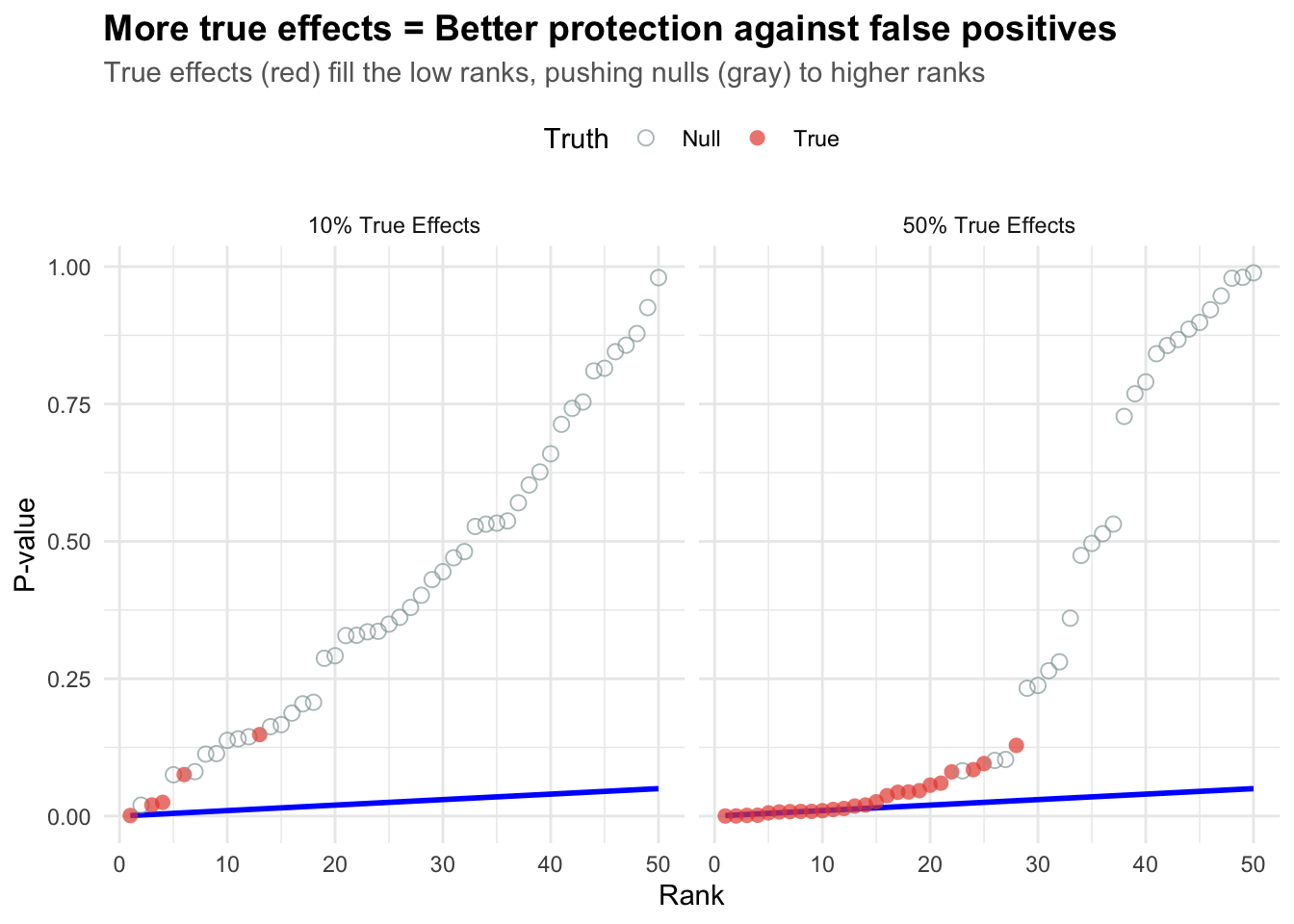 When there are many true effects (right panel), they dominate the low ranks, making it harder for false positives (nulls) to sneak in. This is why BH becomes more efficient when there are more real effects!