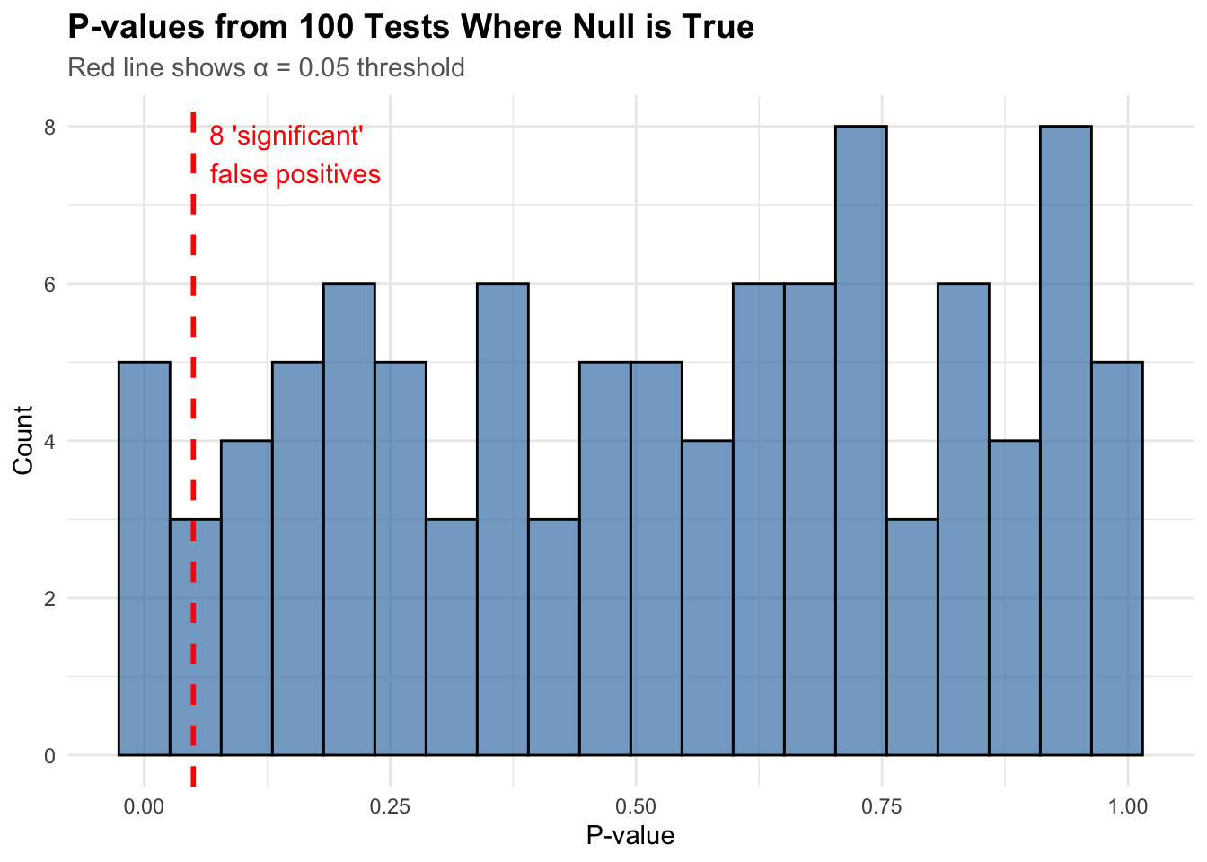 n_tests <-100p_values <-runif(n_tests, 0, 1) # Under null, p-values are uniformly distributed# Count "significant" results at alpha = 0.05n_significant <-sum(p_values <0.05)# Create histogramhist_data <-data.frame(p_value = p_values)ggplot(hist_data, aes(x = p_value)) +geom_histogram(bins =20, fill ="steelblue", alpha =0.7, color ="black") +geom_vline(xintercept =0.05, color ="red", linetype ="dashed", linewidth =1) +annotate("text",x =0.05, y =Inf,label =paste0(n_significant, " 'significant' \nfalse positives"),hjust =-0.1, vjust =1.5, color ="red", size =4 ) +labs(title ="P-values from 100 Tests Where Null is True",subtitle ="Red line shows α = 0.05 threshold",x ="P-value",y ="Count" ) + mytheme