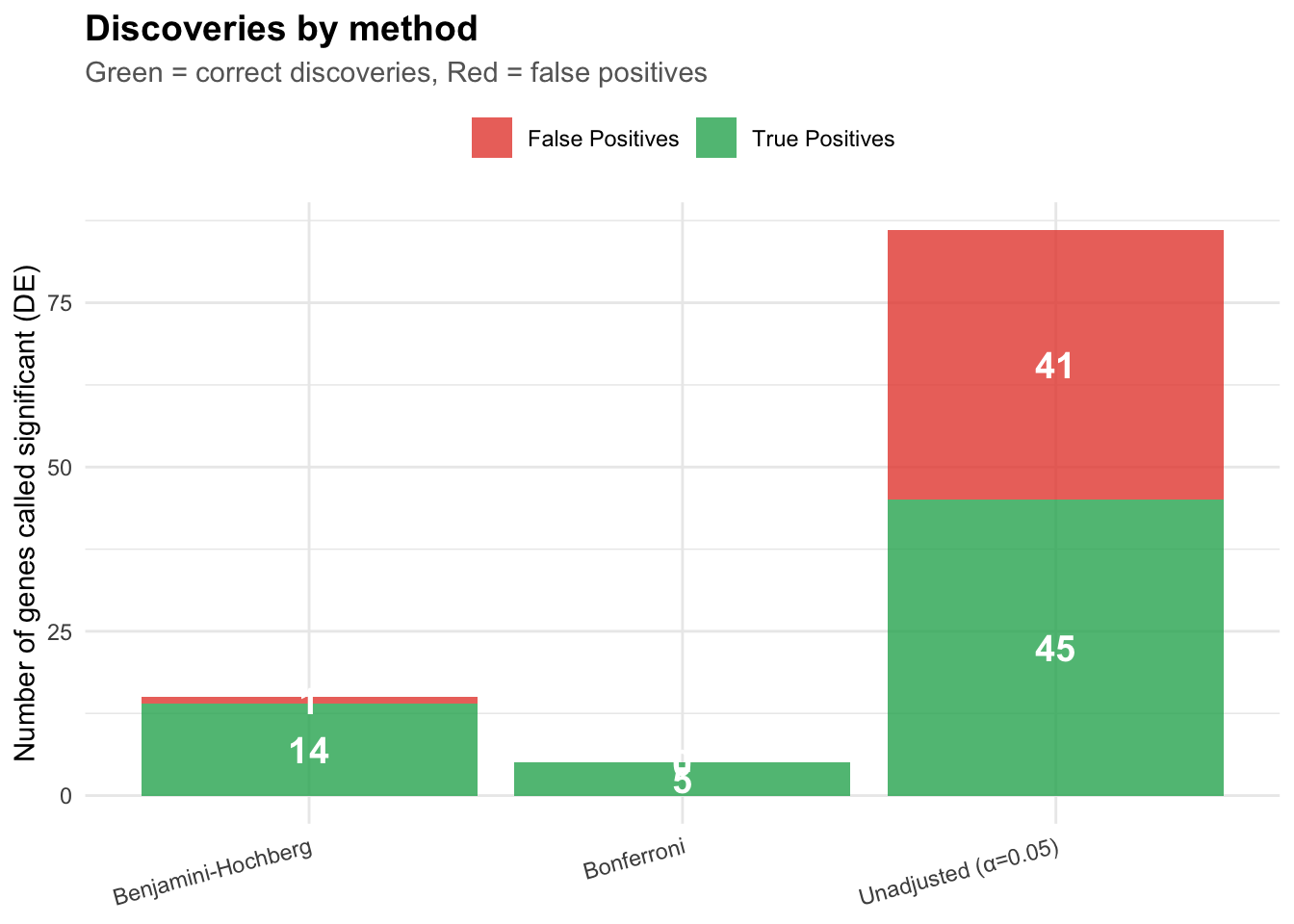 So publishing all 30 genes would mean: - 83% false discovery rate (25 false positives out of 30). Patients tested on these genes get misleading results. Everyone wastes time studying false leads.