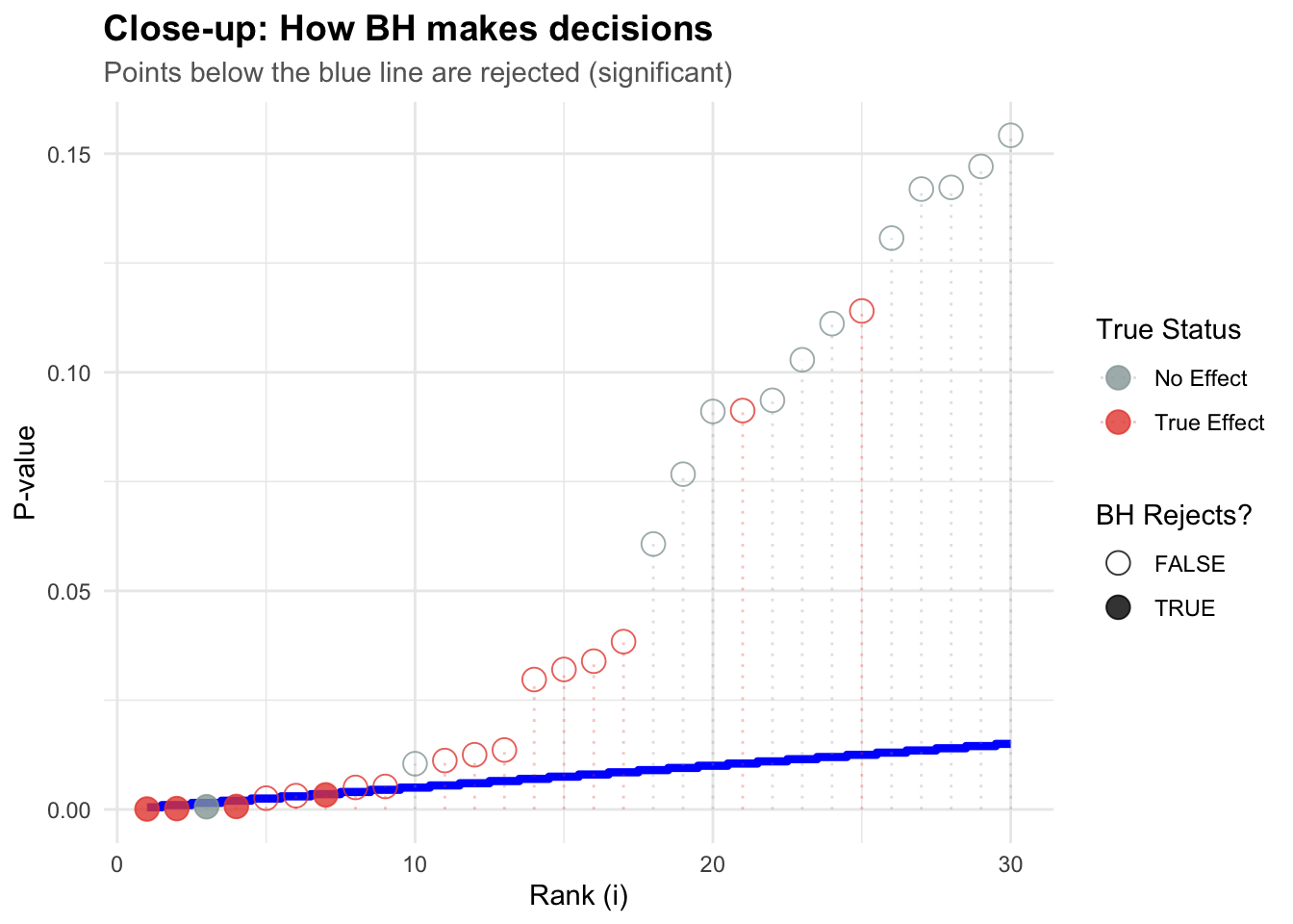 # Zoom in on the first 30 testszoom_data <- test_data %>%filter(rank <=30)ggplot(zoom_data, aes(x = rank, y = p_value)) +# Step function showing BH decisiongeom_step(aes(y = bh_threshold), color ="blue", linewidth =1.5, direction ="mid") +geom_point(aes(color = truth, shape = significant_bh), size =4, alpha =0.8) +geom_segment(aes(x = rank, xend = rank, y =0, yend = p_value, color = truth),alpha =0.3, linetype ="dotted" ) +scale_color_manual(values =c("True Effect"="#E74C3C", "No Effect"="#95A5A6")) +scale_shape_manual(values =c("TRUE"=19, "FALSE"=1),guide =guide_legend(title ="BH Rejects?") ) +labs(title ="Close-up: How BH makes decisions",subtitle ="Points below the blue line are rejected (significant)",x ="Rank (i)",y ="P-value",color ="True Status" ) + mytheme +theme(legend.position ="right")